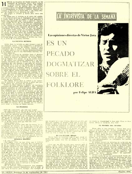 Víctor Jara ha saltado en poco tiempo a uno de los primeros planos, como compositor e intérprete. Enamorado y estudioso del folklore chileno, él está convencido que no posee la verdad absoluta sobre el folklore, sobre el cual se discute permanentemente y no siempre se discute con objetividad rigurosa. Víctor Jara opina así: – «Creo que ninguno de nosotros tiene el derecho de colocarse como juez implacable, incluso dogmático, frente al folklore en general. El folklore auténtico es vigente, vivo, actual; no es un asunto muerto. Me parece muy peligroso, antojadizo y un poco egoísta considerar que el folklore es una obra arqueológica del siglo pasado, y que debe ser interpretada como tal, o si no, no es válida. Eso es absurdo. El folklore es un arte en todo el sentido de la palabra. Su esencia es humana. Ahora, el artista, que interprete esa esencia humana, es el verdaderamente válido. Quien quiera interpretar realmente el alma del pueblo debe recorrer muchos caminos. Y va a tener que recorrer esos caminos junto a ellos, a la mujer que lava, al hombre que hace lazos. al que abre surcos, al que baja a la mina, al que tiende una red en el mar, etc., y no pasar en un auto, mirando por la ventanilla».